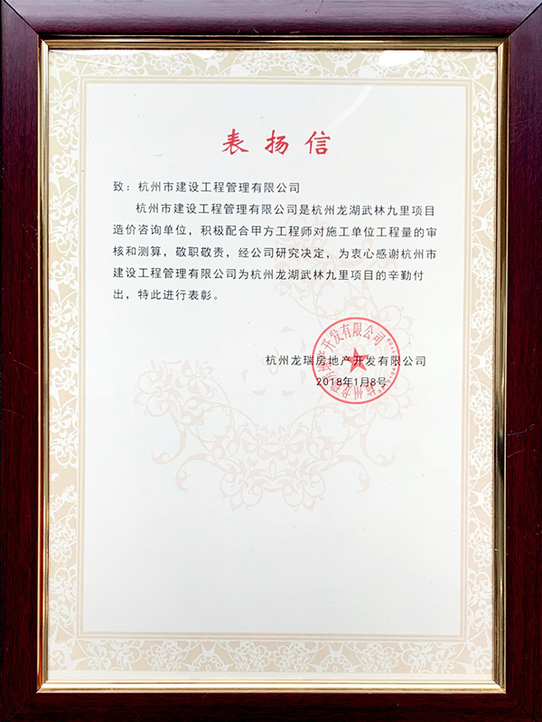 2018年杭州龍湖武林九里項目造價咨詢單位表彰